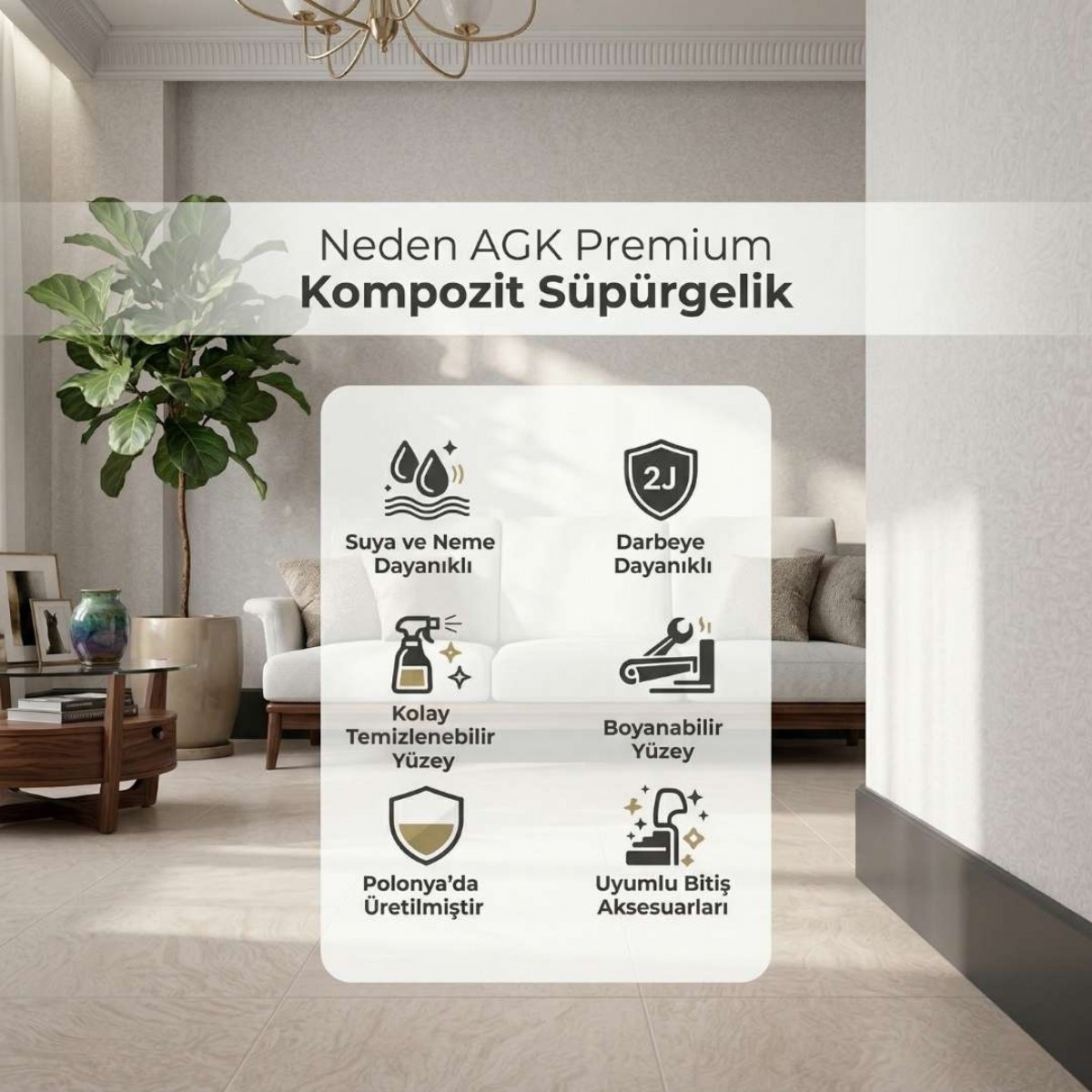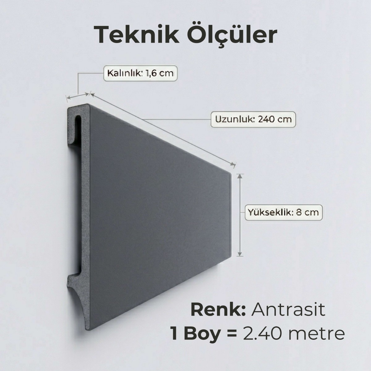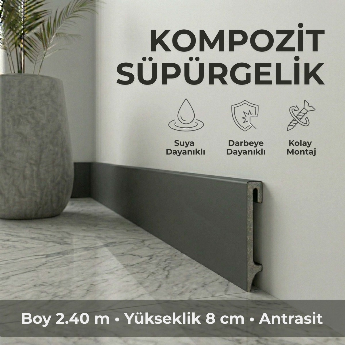 Standart PVC süpürgeliklerden farklı olarak mineral katkılarla güçlendirilmiÅŸ özel polimer yapıya sahiptir. Bu yapı sayesinde klasik içi boÅŸ veya ince duvarlı PVC profillere kıyasla daha saÄŸlam, daha tok ve daha dayanıklı bir kullanım sunar. Estetik görünüm ile iÅŸlevselliÄŸi bir araya getiren yapısı sayesinde hem yaÅŸam alanlarında hem de ticari mekânlarda güvenle tercih edilebilir.