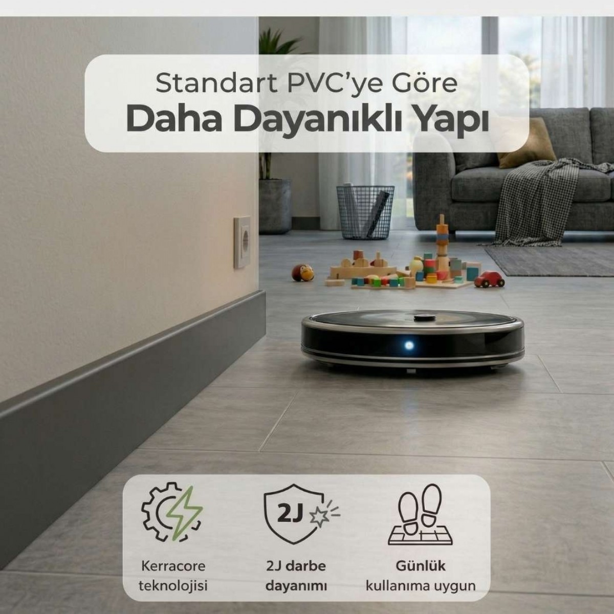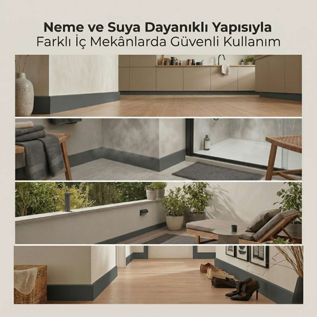 Darbe, suya ve neme karşı dayanıklı yapısı ile günlük kullanıma baÄŸlı deformasyonlara karşı geliÅŸtirilmiÅŸtir. Bu sayede klasik süpürgeliklerde zamanla görülebilen ÅŸiÅŸme, kabarma, çatlama ve form kaybı gibi sorunların azaltılmasına yardımcı olur.