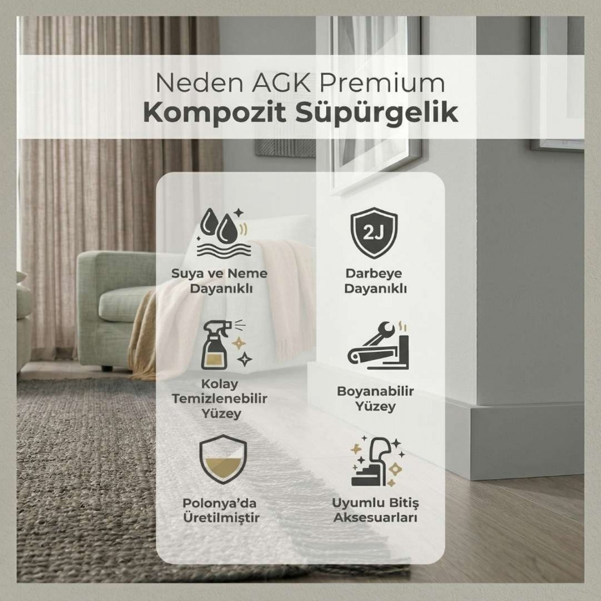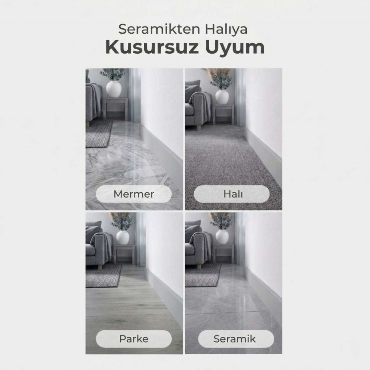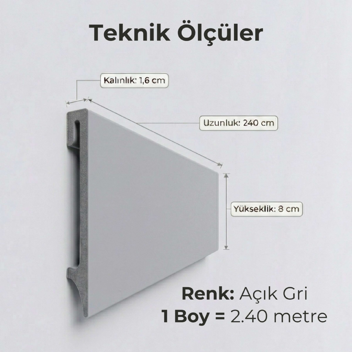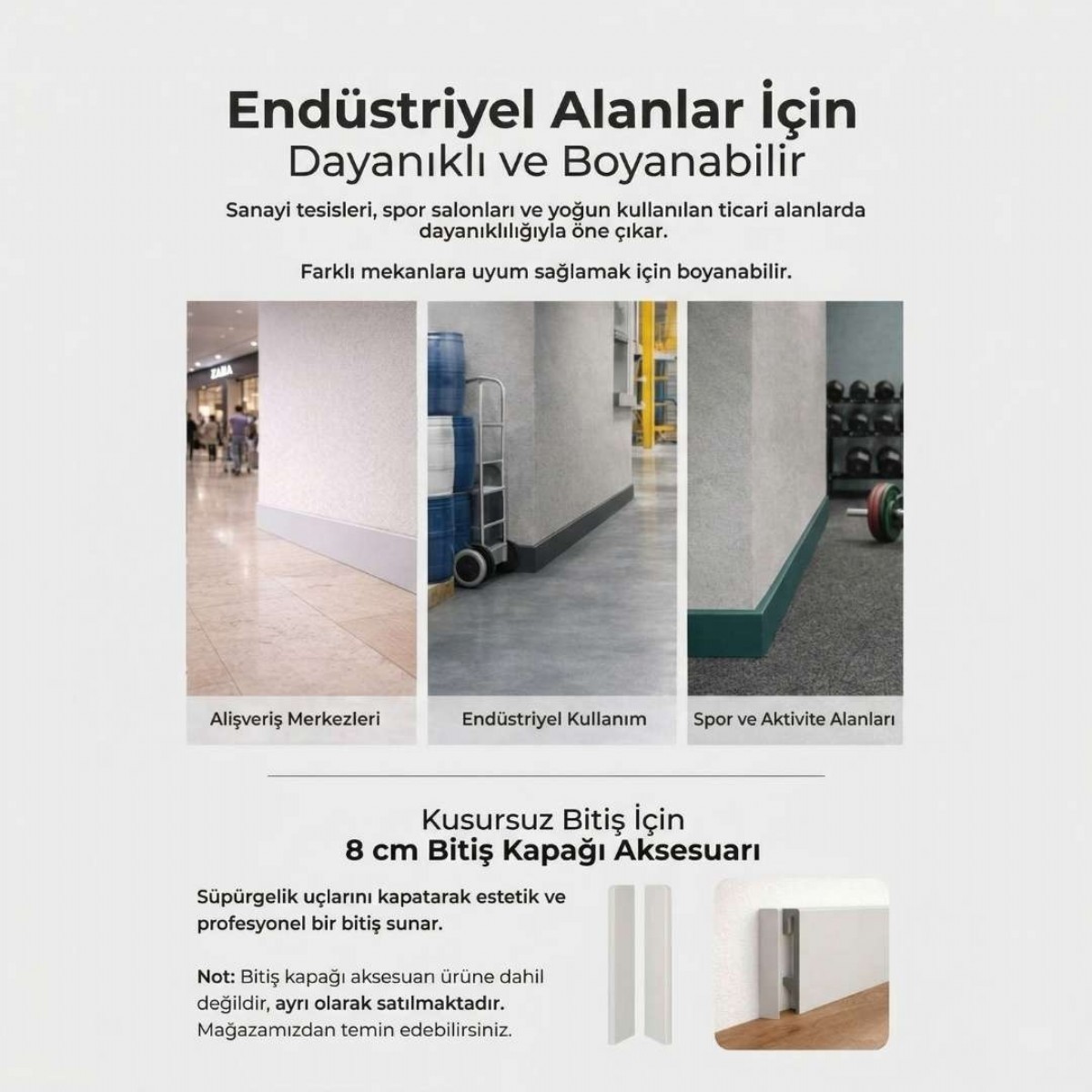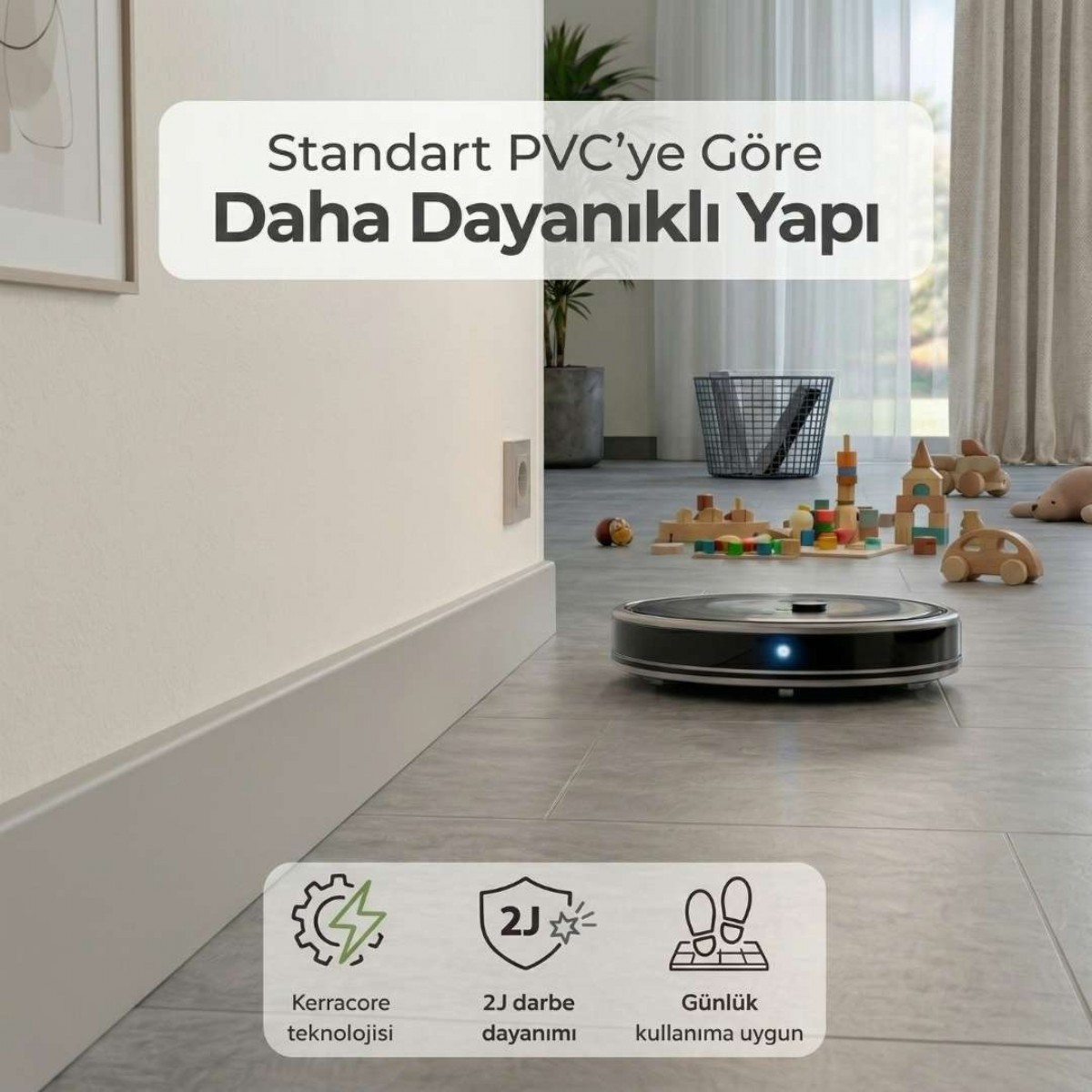 Standart PVC süpürgeliklerden farklı olarak mineral katkılarla güçlendirilmiÅŸ özel polimer yapıya sahiptir. Bu yapı sayesinde klasik içi boÅŸ veya ince duvarlı PVC profillere kıyasla daha saÄŸlam, daha tok ve daha dayanıklı bir kullanım sunar. Estetik görünüm ile iÅŸlevselliÄŸi bir araya getiren yapısı sayesinde hem yaÅŸam alanlarında hem de ticari mekânlarda güvenle tercih edilebilir.