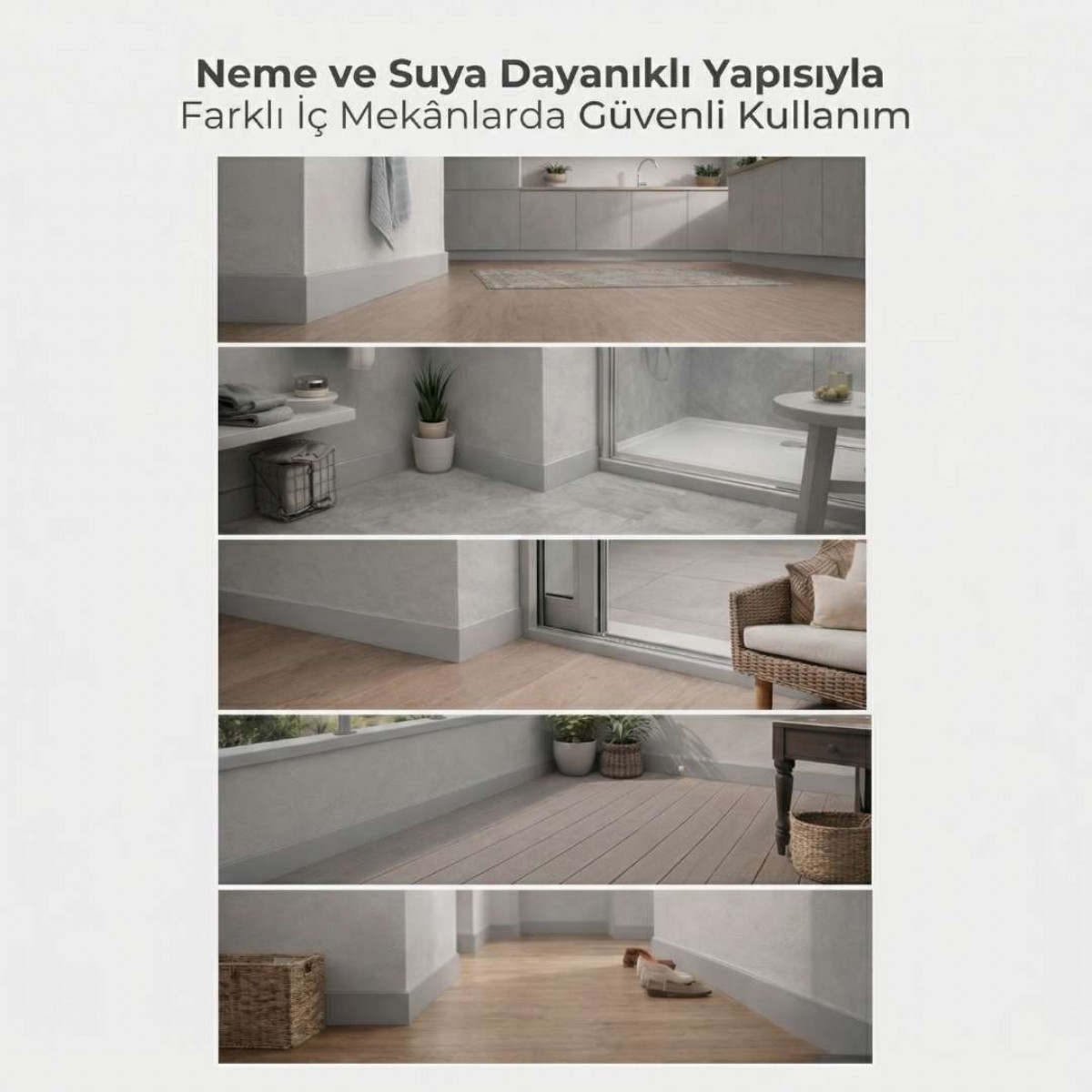 Darbe, suya ve neme karşı dayanıklı yapısı ile günlük kullanıma baÄŸlı deformasyonlara karşı geliÅŸtirilmiÅŸtir. Bu sayede klasik süpürgeliklerde zamanla görülebilen ÅŸiÅŸme, kabarma, çatlama ve form kaybı gibi sorunların azaltılmasına yardımcı olur.
